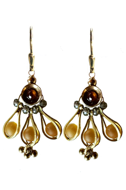 Colorful mix of vintage topaz glass with brass findings on 22K vermeil lever back earring fixtures.