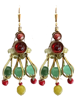 Colorful mix of vintage glass and green garnet and faceted olive jade beads with brass findings on 22K vermeil lever back earring fixtures.