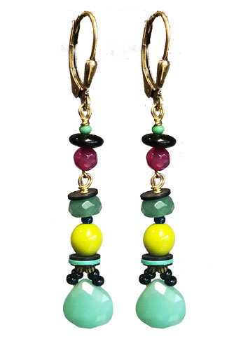 Zippy and colorful dangly two-tiered earrings made with faceted turquoise blue chalcedony, orange aventurine and vintage glass with seed beads on sterling silver lever back earring fixtures. 2"L x .5"W