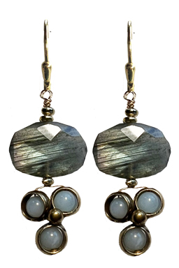 Modern deco design of faceted labradorite and angelite in brass rings on 22K vermeil lever back earring fixtures.