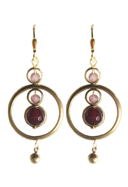 Clean design, easy to wear brass rings with faceted pink apatite and ruby beads with a brass ball dangle on 22K vermeil lever back earring backs.