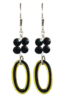 Deco design of onyx beads sitting atop 1940's glass apple juice and jet colored handblown glass hoops on sterling silver lever back earring fixtures.