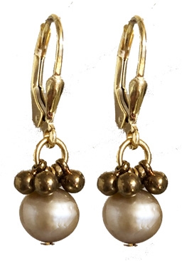 Everyday earrings made with champagne colored freshwater pearls surrounded by brass dangles with 22K vermeil lever back earring fixtures. 1"L x .3"W