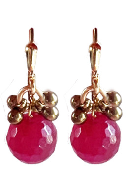 Everyday earrings made with deep magenta faceted new jade beads surrounded by brass dangles and bezels with 22K vermeil lever back earring fixtures. 1"L x .3"W