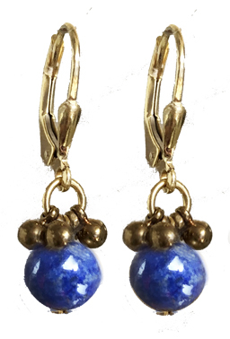 Small elegant earrings made with lapis lazuli beads surrounded by brass dangles and bezels with 22K vermeil lever back earring fixtures.