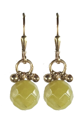 Everyday earrings made with pale faceted olive jade beads surrounded by brass dangles and bezels with 22K vermeil lever back earring fixtures. 1"L x .3"W