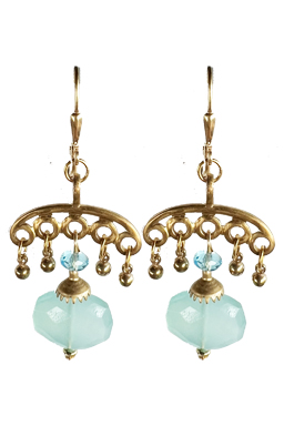 Faceted aquamarine with turquoise crystal and brass accents on 22K vermeil leverbacks earring fixtures. 2"L x 1"W
