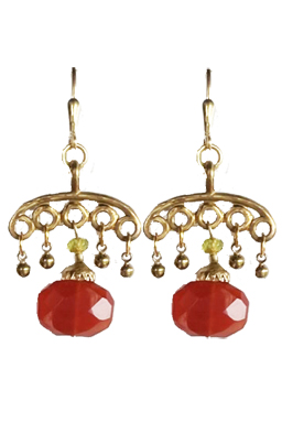 Faceted carnelian with olive crystal and brass accents on 22K vermeil leverbacks earring fixtures. 2"L x 1"W