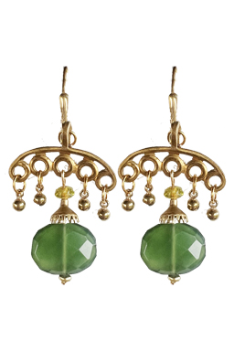 Faceted serpentine jade with olive crystal and brass accents on 22K vermeil leverbacks earring fixtures. 2"L x 1"W