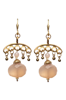 Faceted rose colored chalcedony with rose glass and brass accents on 22K vermeil leverbacks earring fixtures. 2"L x 1"W