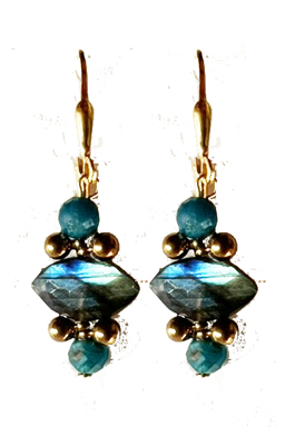Small jewel touch earring with faceted labradorite and brass ball and teal apatite accents on 22K vermeil lever back earring fixtures.