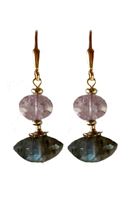 Marquis shaped labradorite and light amethyst beads with brass findings and faceted amethyst accents on 22K vermeil lever back earring fixtures.