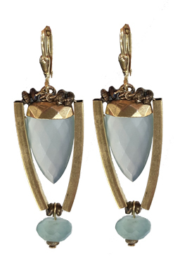 Contemporary design with faceted aqua chalcedony gemstones with brass bars and 22K vermeil bezel and leverback earring fixtures.