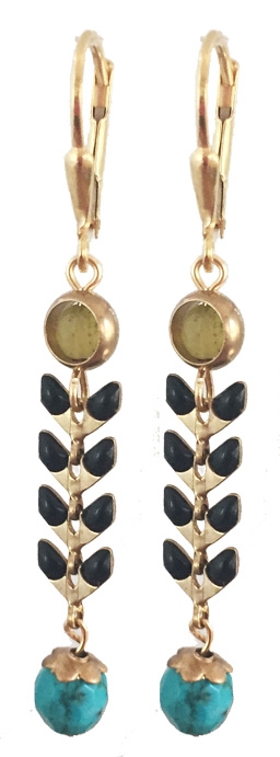 Brass & jet enamel chain with olive jade & dyed Chinese turquoise drops on 22K vermeil lever back earring fixtures. 2"L x .25"W