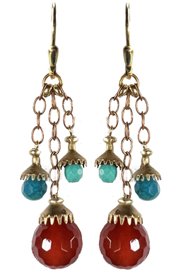 Elegant modern arrangement of faceted carnelian, apatite and chinese turquoise beads with brass chain dangles and caps on vermeil leverback earring fixtures.