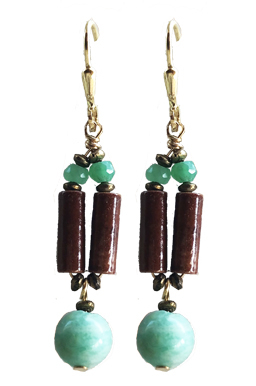 Vintae brown glazed porcelain beads with faceted chyrsoprase green and blue/green chryscolla drops on 22K vermeil lever back earring fixtures.