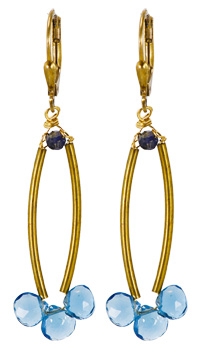 Delicate blue earrings with brass sides above iolite clouds with pyrite accents on 22K vermeil lever back earring fixtures. 1.5"L x .75"W