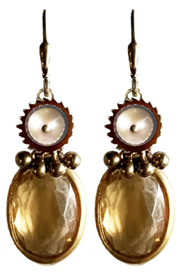 White freshwater pearls atop brass accents and vintage beige faceted jewels on 22K vermeil faceted lever back earring fixtures.