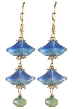 Fancy glass blossoms in blue/green glass with faceted olivine glass drops and brass accents with 22K vermeil lever back earring fixtures.