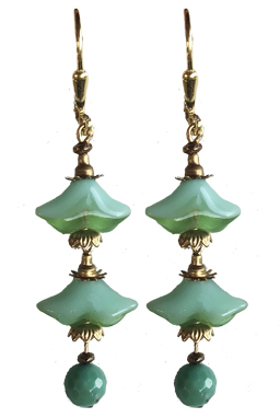 Fancy glass blossoms in milky blue/pistachio green with faceted chrysoprase drops and brass accents with 22K vermeil lever back earring fixtures.