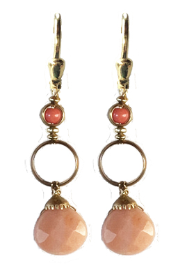 Faceted pale coral dyed agate doublets with coral glass accents and brass beads on 22K vermeil lever back fixtures.