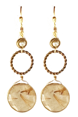 Golden rutilated quartz drops with faux pearl accents and brass beads on 22K vermeil lever back fixtures.