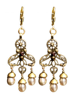 Elegant byzantine design in handmade brass filigree finding with freshwater champagne color pearls with brass caps on 22K vermeil leverback earring fixtures.