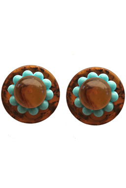 1950's Bakelite tortoise colored base with turquoise vintage floral plastic on clips or post backs. 1.25" diameter .75" thick