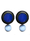 Jet plastic base with porcelain royal blue cabouchons with '60's periwinkle resin drops on clip or post earring backs. Please specify which you prefer. 1.5"L x 1"W