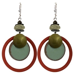 Best seller! Kitch vintagey everyday hoop earrings made with pale vintage mauve and olive plastics (including Bakelite) and mint porcelain disc, jet accents and faceted new jade and prehnite on sterling silver lever back earring fixtures. 2"L x 1"W