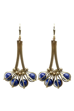 Elegant modern art deco design with vintage and new brass findings with lapis lazuli beads on 22K vermeil lever back earring fixtures. 2"Long x 1.25"Wide