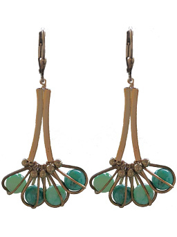 Elegant modern art deco design with vintage and new brass findings with assorted shades of polished Chinese turquoise beads on 22K vermeil lever back earring fixtures. 2"Long x 1.25"Wide