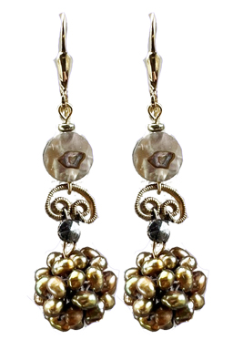 Cluster of bronze freshwater pearls with mother of pearl, and vintage markasite acceent on 22K vermeil lever back earring backs.