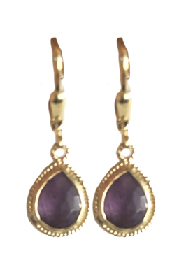 Vermeil fancy bezel around faceted amethyst round cut stones on 22K vermeil lever back earring backing. .4"L x .25"W