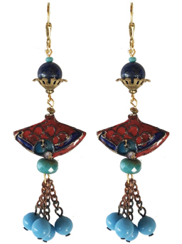 Limited edition Chinese enamel beads mixed with lapis lazuli and vintage glass tassel and crystal accents on vermeil lever back earring fixtures. 1.5L x .5"W