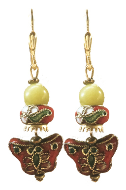 Limited edition Chinese enamel beads mixed with olive jadeon 22K vermeil lever back earring fixtures.