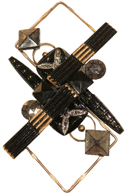 Super deco design made from jet, gunmetal and brass colored vintage materials including 1920's-'40's deco glass and '60's brass. 2"W x 3"H