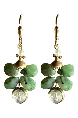 Chryscolla pistachio green natural stone with faceted new jade and brass accents on 22K vermeil lever back earring fixtures.