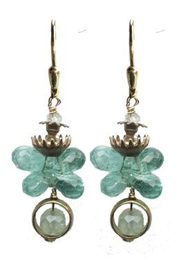 Faceted apatite with prehnite and brass accents on 22K vermeil lever back earring fixtures.