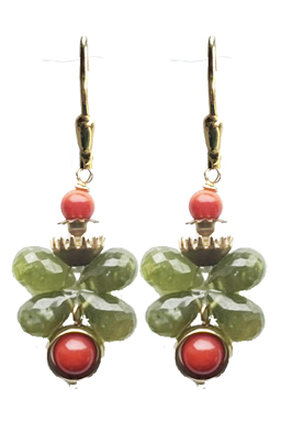 Faceted olive hydrocrystal with red coral and brass accents on 22K vermeil lever back earring fixtures.