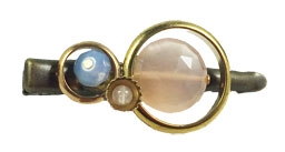 Mod arrangement of faceted fancy pale pink chalcedony with rose quartz and milky pink crystal accents with brass rings on antiqued bronze toothed hair clip to pin up a bit of hair. 1.75" L x .5" W