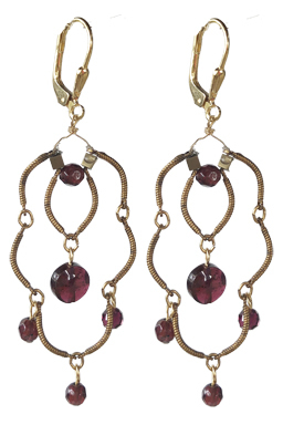 Vintage feeling, airy light earrings in garnet with lacey brass chain on 22K vermeil leverback earring fixtures.