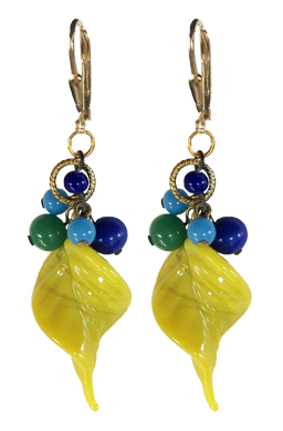 1960's chartreusey yellow twist with '50's-'60's vintage glass blue and green accents on 22K vermeil leverback earring fixtures. 1.75"L x .75"W