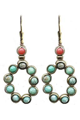 Faceted chrysoprase and smooth dyed coral beads encased in brass rings on 22K vermeil lever back earring fixtures.