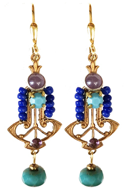 Gothic style small but detailed brass bases with 1940's milky amethyst glass cabouchon centers, '60s' bezeled turquoise stones and turquoise glass dangles on 22K vermeil lever back earring backs.