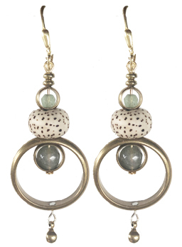 Clean design, easy to wear brass rings with faceted labradorite and dalmation jasper beads with a brass ball dangle on 22K vermeil lever back earring backs.