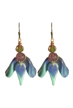 Blue glass petals with faceted amethyst and Peking jade accents on 22K vermeil lever back earring fixtures.