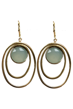 Brass ovals surrounding 22K vermeil bezeled, faceted, iaqua chalcedony circles on 22K vermeil lever back fixtures.