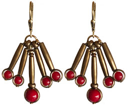 Elegant deco brass rays with red beads on 22K vermeil lever back earring fixtures. 2"L x .75"W