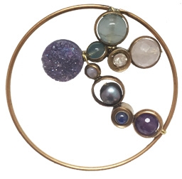 Modern mix of amethyst druzy, flourite, freshwater pearls and rose quartz encased in vintage and new brass rings with '60's smooth and faceted rhinestone accents. 3.25" diameter.